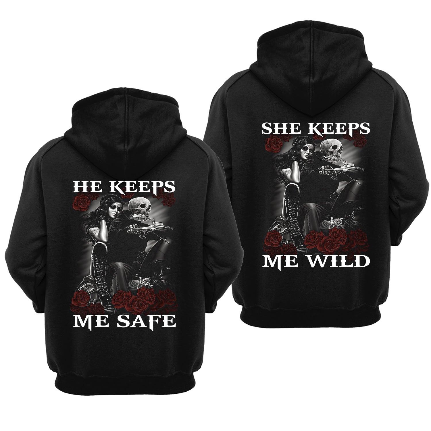 Motorcycle Skeleton Couple Ride Or Die She Keeps Me Wild Valentine Gift Couple Matching Hoodie