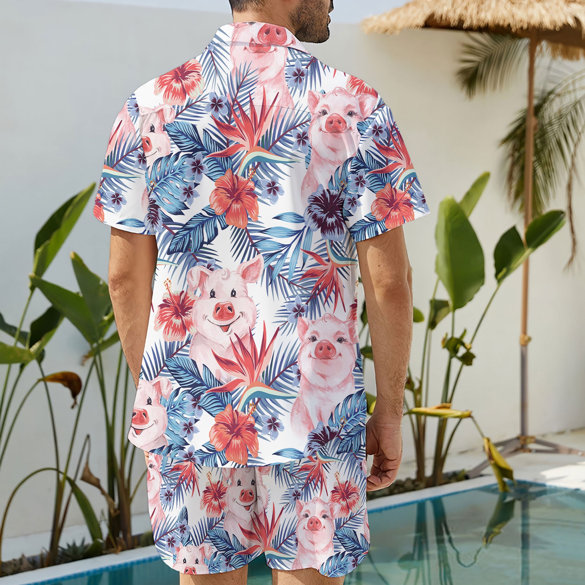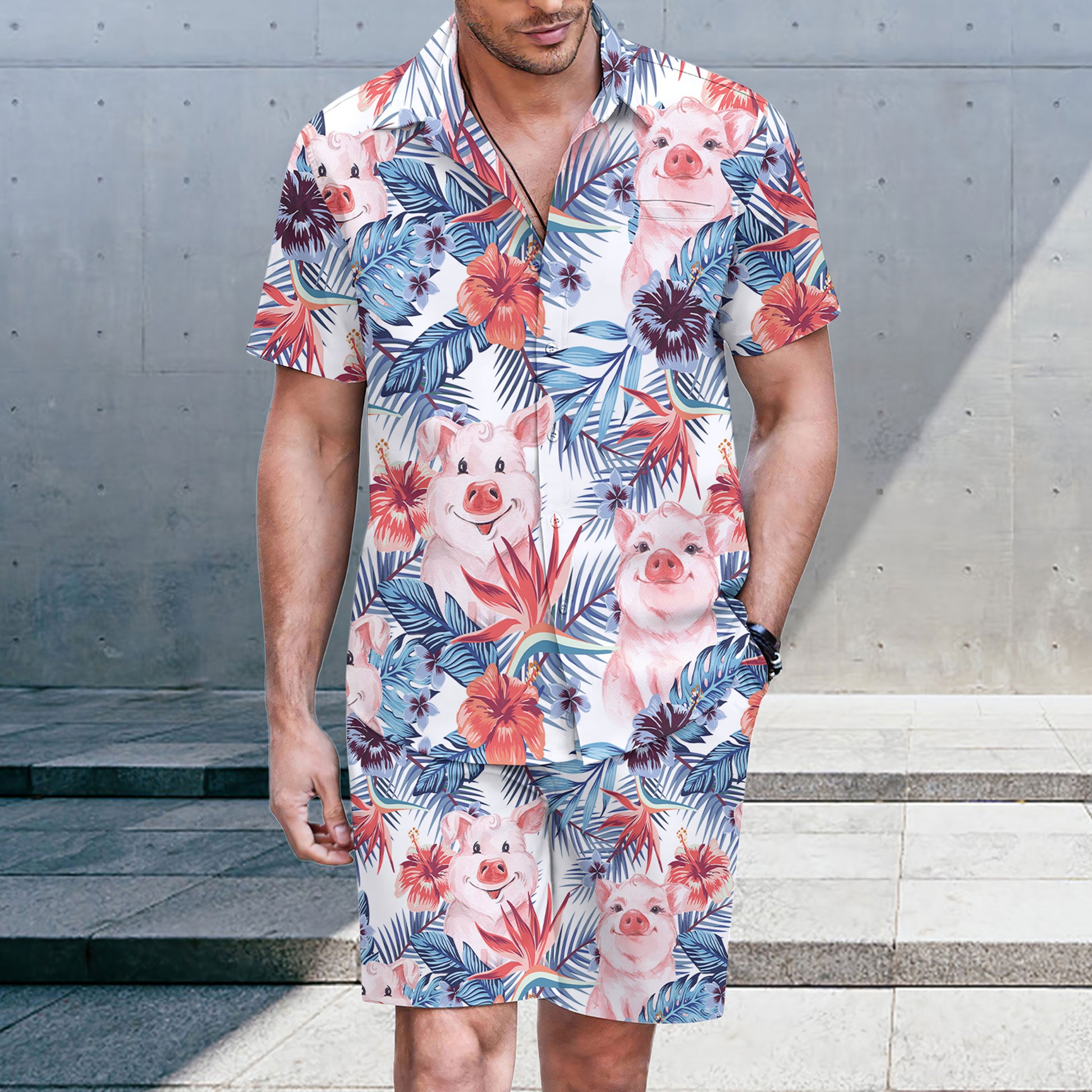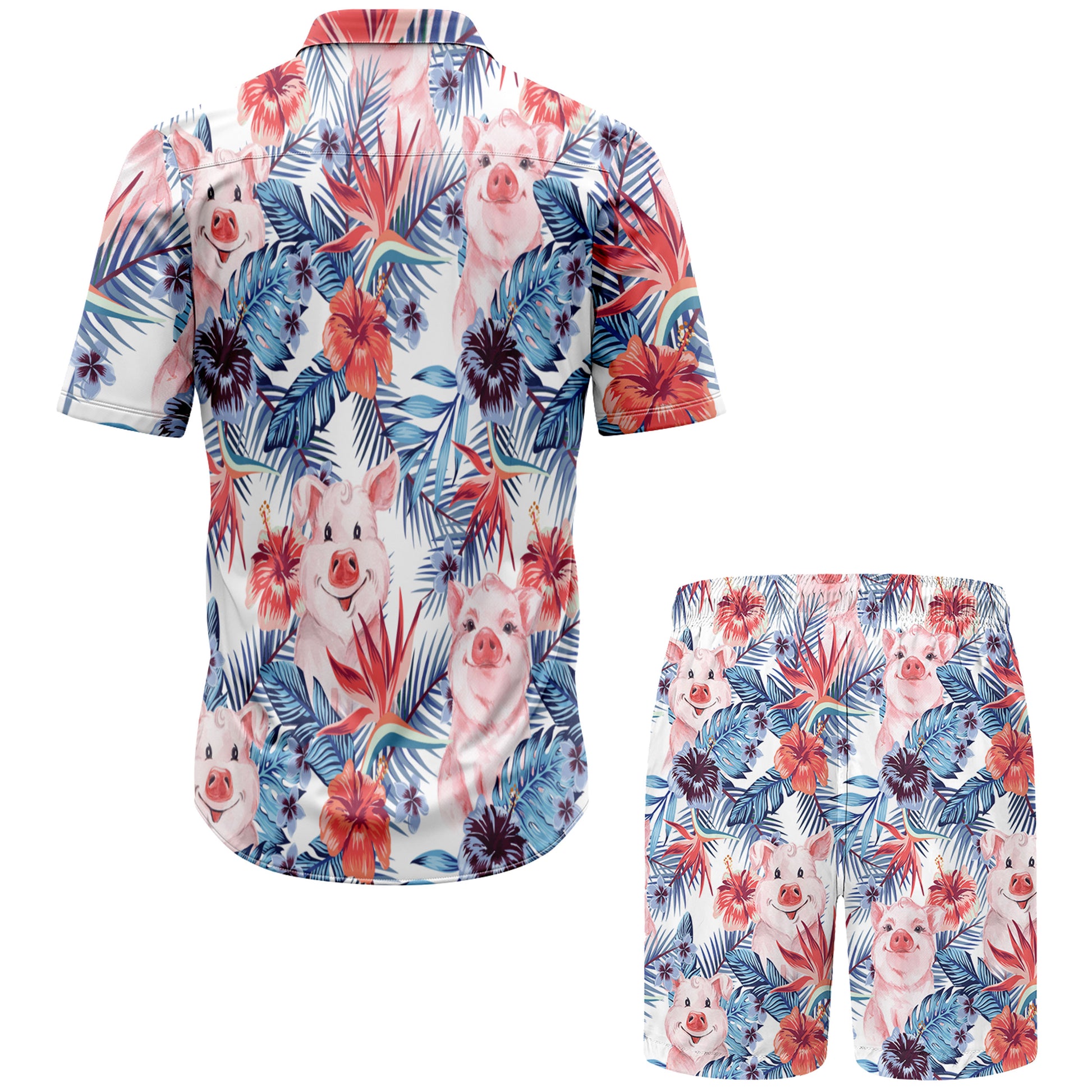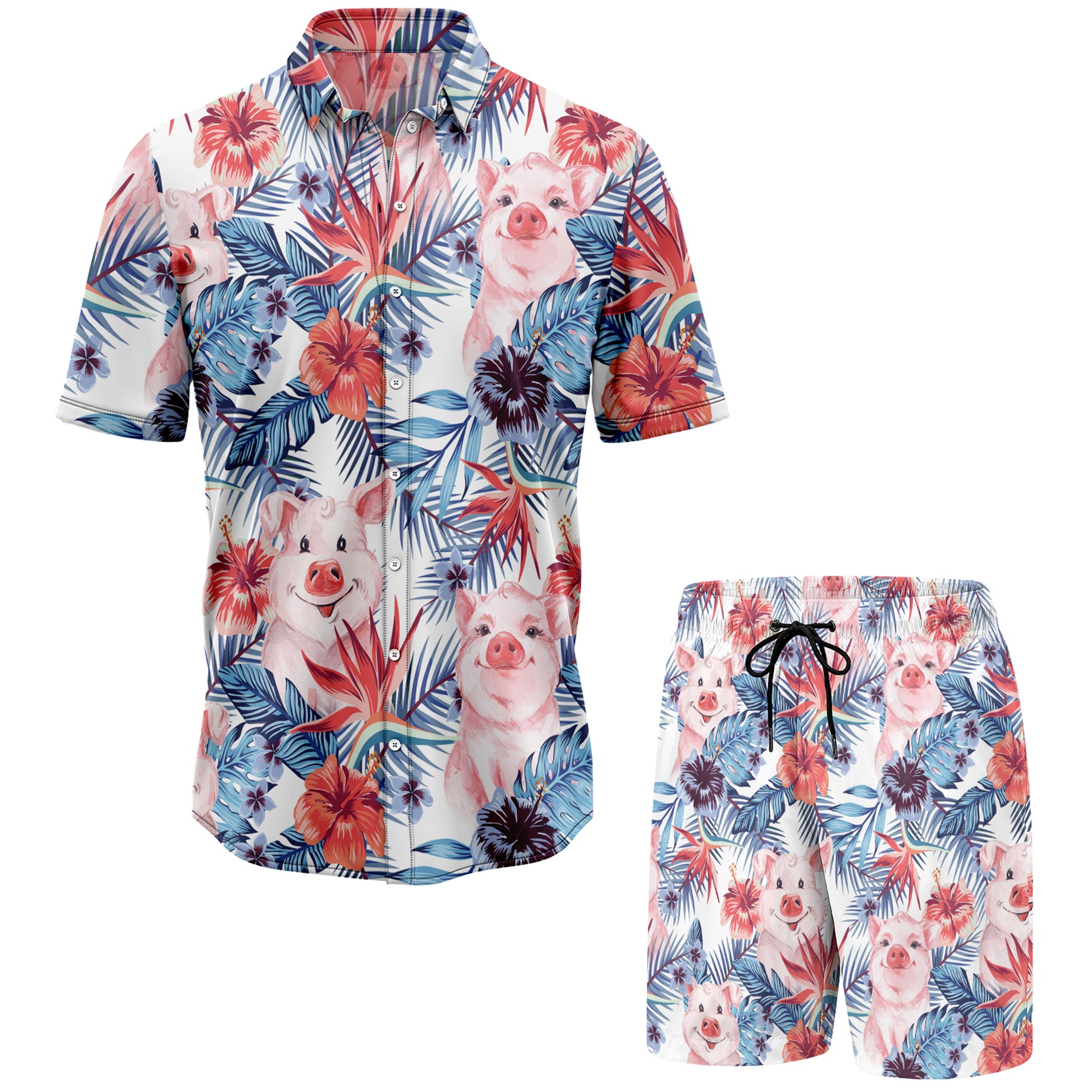 Cute Pig And Tropical Flowers Hawaiian Shirt And Shorts