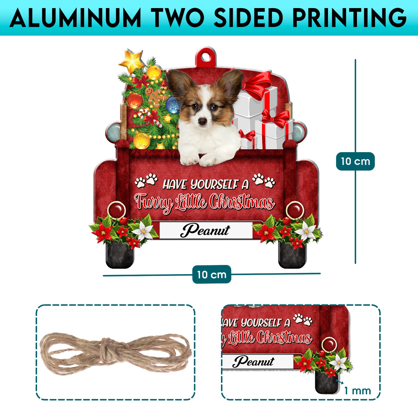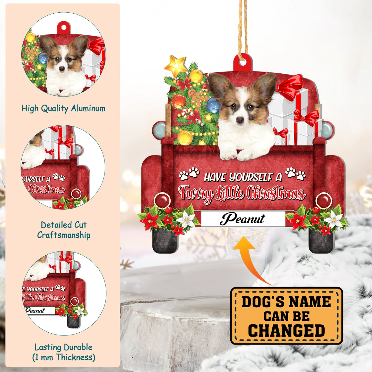 Personalized Papillon Red Truck Christmas Aluminum Ornament